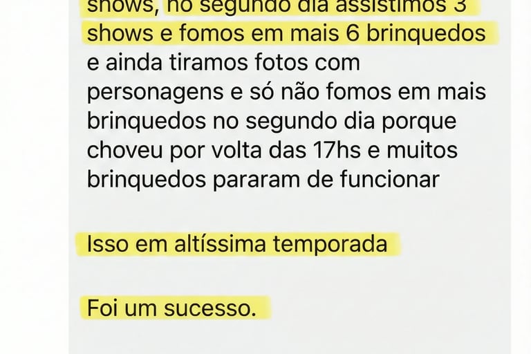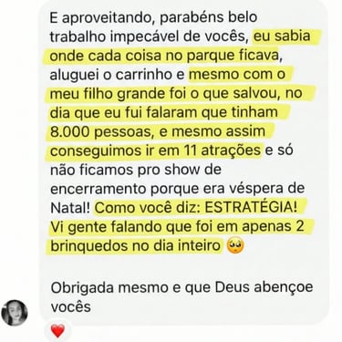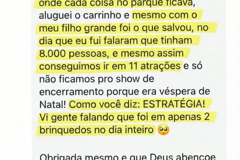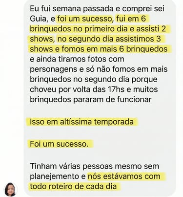 Você vai saber exatamente os melhores horários de cada show e brinquedo, o tempo real entre uma atração e outra, e onde vale a pena descansar ou comer sem perder tempo.