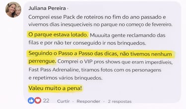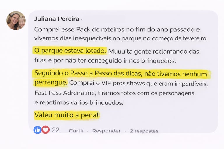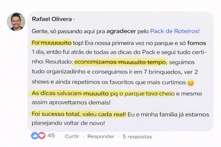 Você vai saber exatamente os melhores horários de cada show e brinquedo, o tempo real entre uma atração e outra, e onde vale a pena descansar ou comer sem perder tempo.